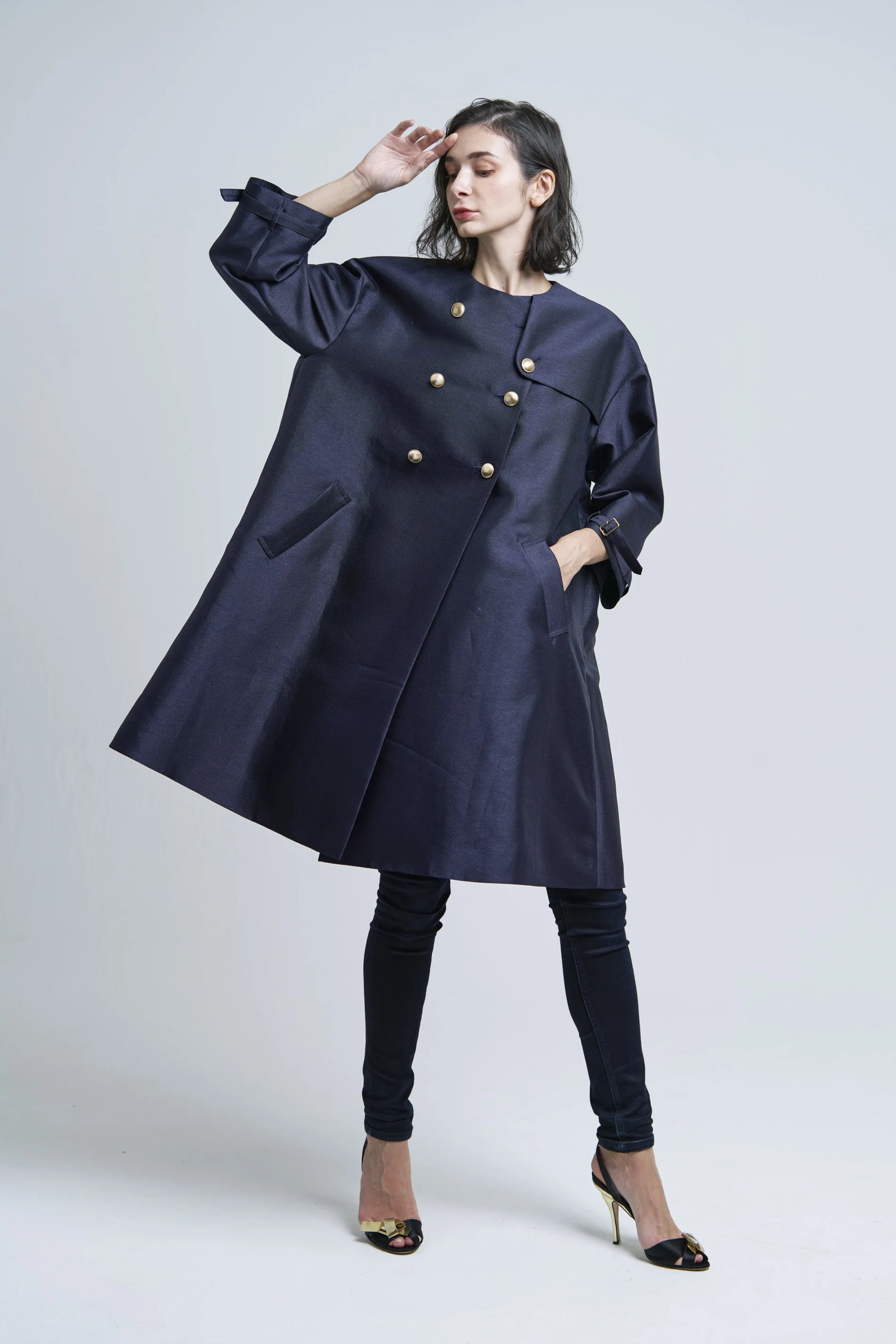 コンパクトな袖と肩まわりから一転,裾にかけてスーパーボリュームで広がるコートワンピース。華やかで上品な光沢感のあるミカド布地で仕立てました。前開きボタンが裾まで付いており,ワンピースとしてはお呼ばれドレスや式典シーンにも。羽織りとして使えばパンツスタイルにも効相性のシャープなシルエットに。流行に左右される事のないエレガントな佇まいで,様々なシーンを彩ってくれる一枚です。